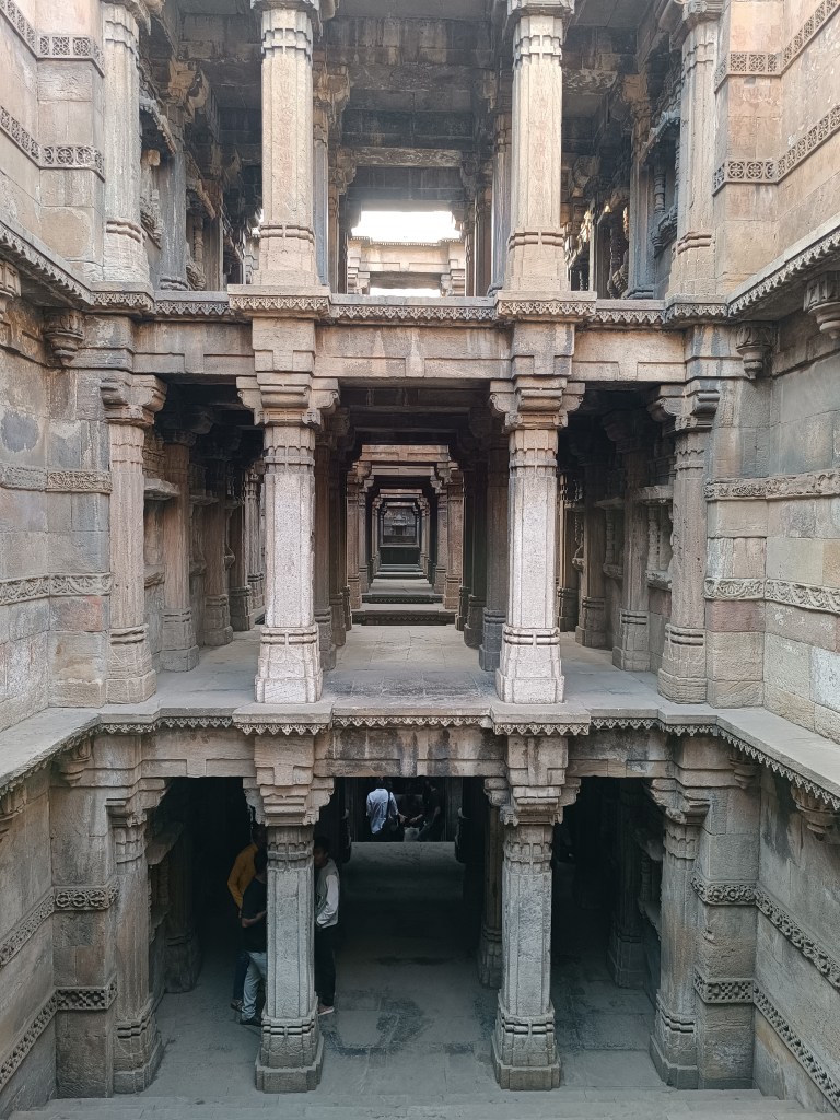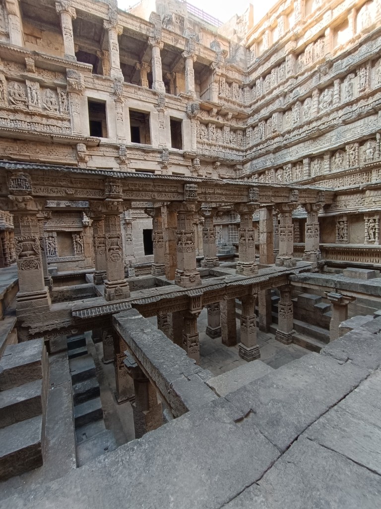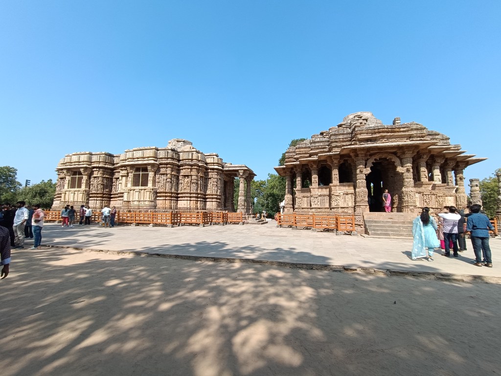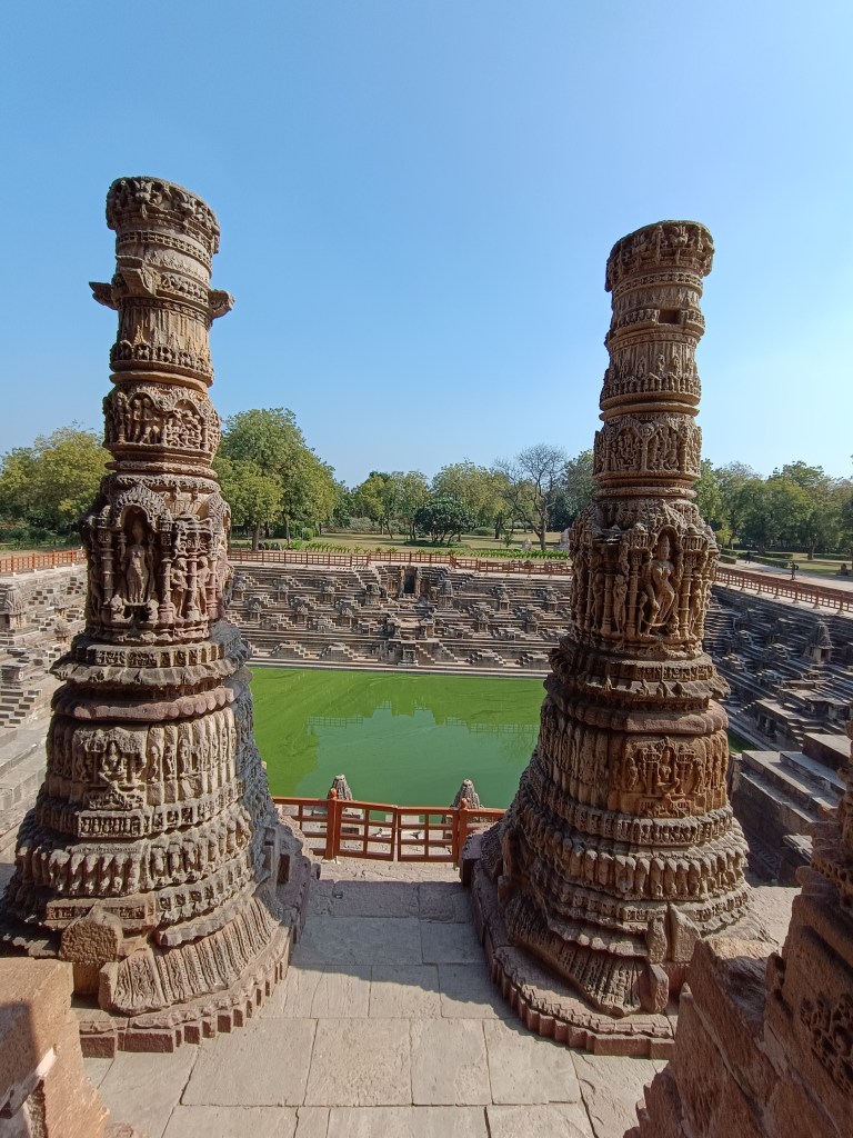 DAY 3 : A one-hour drive in the morning took us to the simply exquisite Modhera Sun Temple. The other Sun temple I had seen was the Konark Sun temple in Odisha. This one was no less in grandeur, as the pictures will show. The main hall consists of the Garbhagriha. Two exquisitely carved pillars lead to the reservoir (Surya kund) in front of the main assembly hall ( Sabhagriha) of the temple. This kund has hundreds of steps leading to the bottom. You can see many shrines located at certain points along the sides.