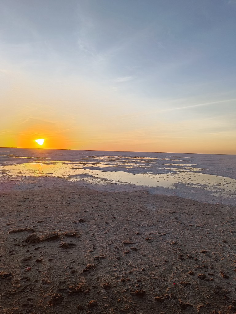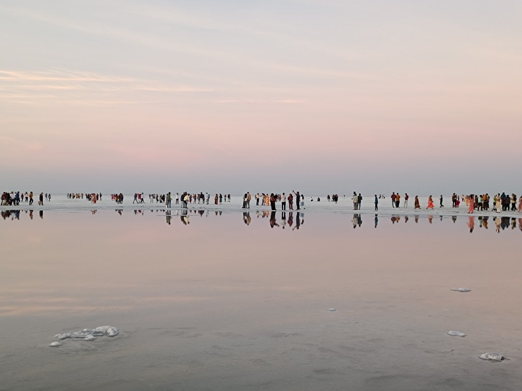 We reached Bhuj at 2.30 pm and after a quick lunch we took off for the Rann of Kutch (or Kachchh) and reached there in 90 minutes. The white sands (white because of the salt) are close to Dhordo, a village known for the spectacular Rann festival. We had to walk quite a bit to reach the salt marsh where we soaked in the beautiful sunset with the white salt turning orange all around us. We hitched a ride in one of the camel carts while returning to Dhordo. During our time there, the Rann festival was in full swing and along with the lights, décor and eats, we could hear music all around us.